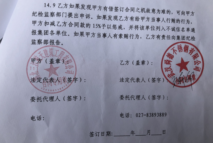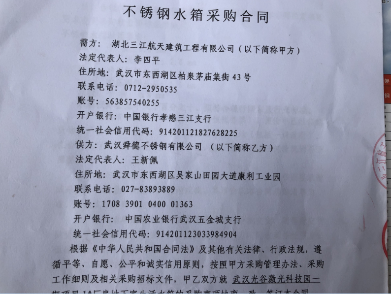 10月10日湖北三江航天建筑有限公司將武漢光谷激光科技園一期項(xiàng)目不銹鋼消防水箱轉(zhuǎn)包給我公司,并于湖北三江航天建筑有限公司簽訂《不銹鋼水箱定制安裝合同》。湖北三江航天建筑有限公司位于武漢市東西湖區(qū)柏泉農(nóng)場(chǎng)商業(yè)街西正街54號(hào),注冊(cè)資金為5022.965萬(wàn)元萬(wàn)元,聯(lián)系人是李四平。目前的經(jīng)營(yíng)范圍是房屋建筑工程施工總承包(貳級(jí));市政公用工程施工總承包(叁級(jí));建筑防水工程專(zhuān)業(yè)承包(叁級(jí));自有物資設(shè)備租賃、房屋租賃。合同約定付定金,工程材料進(jìn)場(chǎng)安裝完畢做試水合格后三天內(nèi)付完余款,訂立合同后,武漢舜德不銹鋼水箱廠即按約定期限進(jìn)場(chǎng)施工,采用包工包料含制作、安裝、水箱基礎(chǔ)槽鋼及水箱配件含法蘭(進(jìn)水孔管、出水孔管、排污孔管、溢流孔管、透氣孔管、檢修孔、扶梯)以及運(yùn)輸、裝卸、現(xiàn)場(chǎng)吊裝到位,直至按裝完畢。甲方要求不銹鋼消防水箱焊接要保證無(wú)虛焊、無(wú)夾渣,焊條選用高于基材型號(hào)。表面光滑、無(wú)裂紋、焊縫無(wú)氣泡,內(nèi)襯結(jié)構(gòu)排列要?jiǎng)蚍Q(chēng),無(wú)毛刺。確保水箱各面保持垂直,垂直度不大于5%,水箱滿(mǎn)載時(shí)箱壁無(wú)變形、無(wú)滲漏。水箱基礎(chǔ)槽鋼架及外梯穩(wěn)定牢固,經(jīng)久耐用。我公司于2019年10月15號(hào)如約完成該工程的施工,并于2019年15月18號(hào)試水合格。我們企業(yè)以過(guò)硬的質(zhì)量、超前的技術(shù)、細(xì)致的服務(wù)做保障,真誠(chéng)的為每一位用戶(hù)服務(wù),力爭(zhēng)買(mǎi)一次產(chǎn)品,交長(zhǎng)久朋友。著誠(chéng)信務(wù)實(shí)、追求卓越、質(zhì)量為本、科技興業(yè)企業(yè)精神始終堅(jiān)持以質(zhì)量求生存,以信用求發(fā)展,以市場(chǎng)為導(dǎo)向,以誠(chéng)信為原則的宗旨,贏得了廣大客戶(hù)的信譽(yù)和信任。