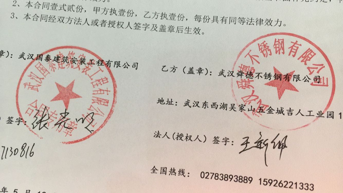 武漢國(guó)泰建筑安裝工程有限公司和我公司合作不銹鋼水箱,合同已貼出。