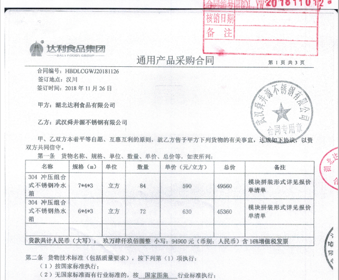公司與湖北達利園集團已是合作伙伴了,這次要做的是一臺72噸不銹鋼冷水水箱,一臺84噸熱水水箱,這回是6號工廠生產(chǎn)線,合同簽訂完畢后按約定期限生產(chǎn)安裝,并于2018年11月30日安裝完畢。經(jīng)達利園集團領導驗收合格后一次性支付工程尾,附合同。